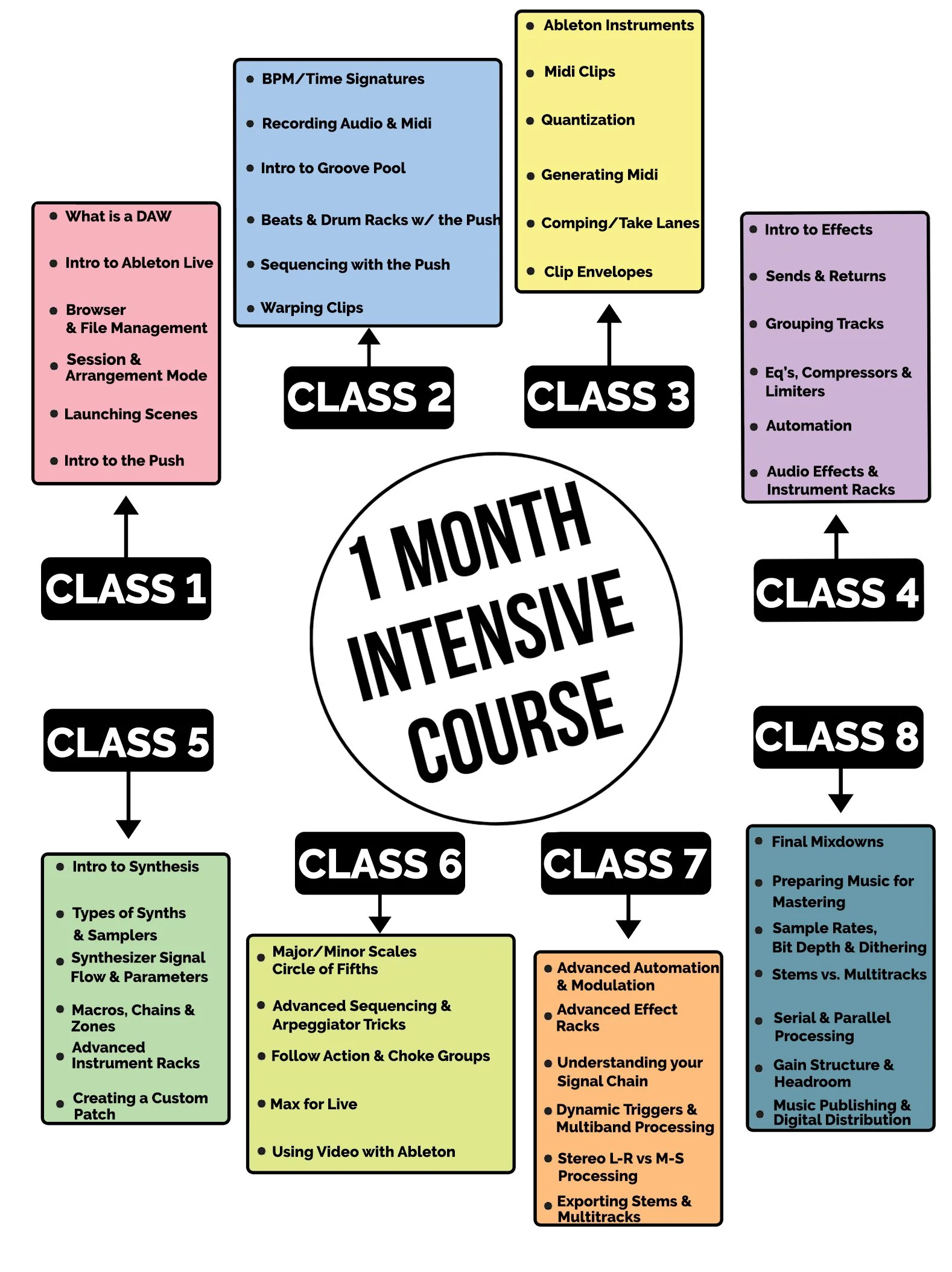The 1 month online intensive courses, and One-On-One sessions allow users to start with the very basics, and move towards more advanced Ableton production techniques. Each month there are a series of 8 classes, each 2 hours in duration. Click the images below, for a day-to-day overview of the topics covered. Addition to the classes, we provide you with, Ableton templates, Custom presets/packs and access to our Splice sound bank. Any student enrolled in our programs, will receive access to our Ableton Educational discounts for software and hardware.